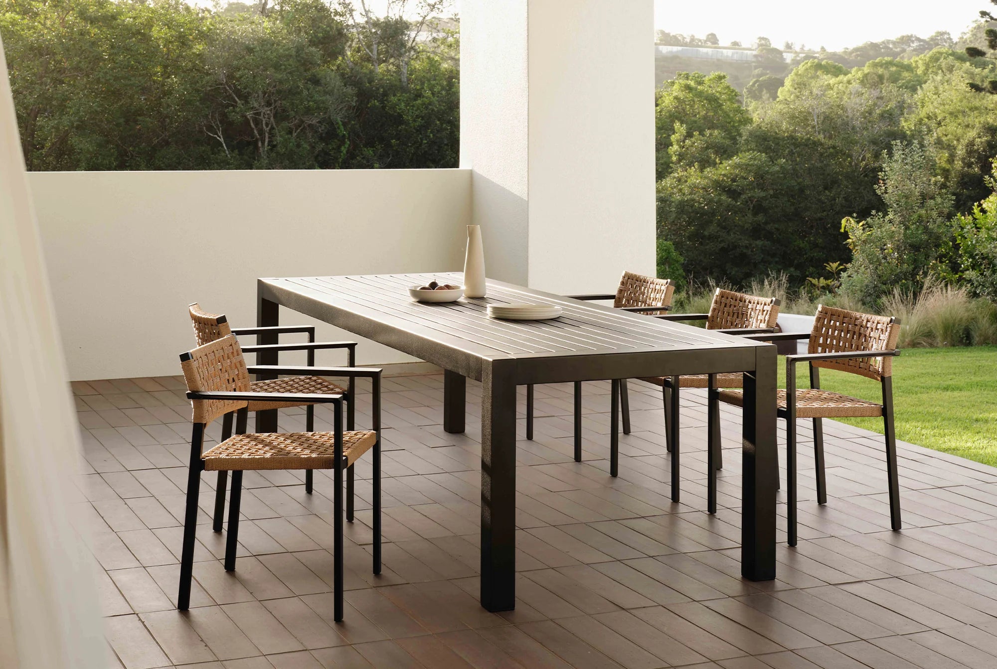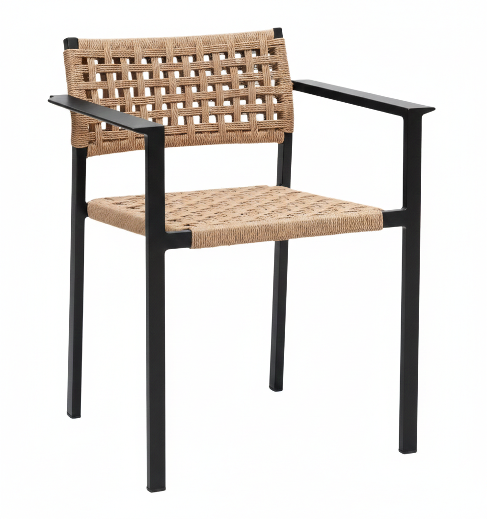 The slim profile of the Outdoor Delphi Dining Chair is offset by an open weave of outdoor woven PE wicker providing shape and structure to the seat and back.